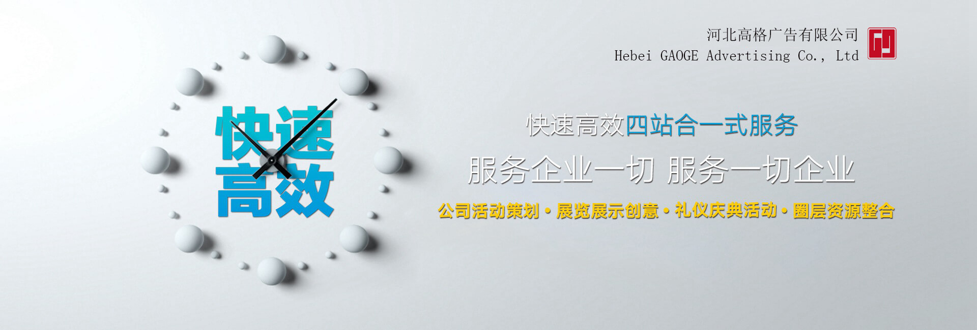 河北高格廣告有限公司是一家專業(yè)致力于大型文化活動組織策劃、展覽展示工程策劃、展臺設計制作、特裝展臺搭建、會議會場布置、巡回展覽、路演、公關推廣執(zhí)行、會議慶典禮儀、路演設備租賃、倉儲等一站式的專業(yè)服務公司。本公司憑借創(chuàng)新領先的服務理念,大型的廠房空間,現代化的機械設備,高素質專業(yè)的服務團隊,及在該行業(yè)多年的實戰(zhàn)經驗,為地產營銷提供了優(yōu)秀的活動方案、為不同行業(yè)的數千家企業(yè)提供了專業(yè)個性化的空間展示方案,幫助客戶實現了自我品牌的提升和企業(yè)利潤的雙贏。...